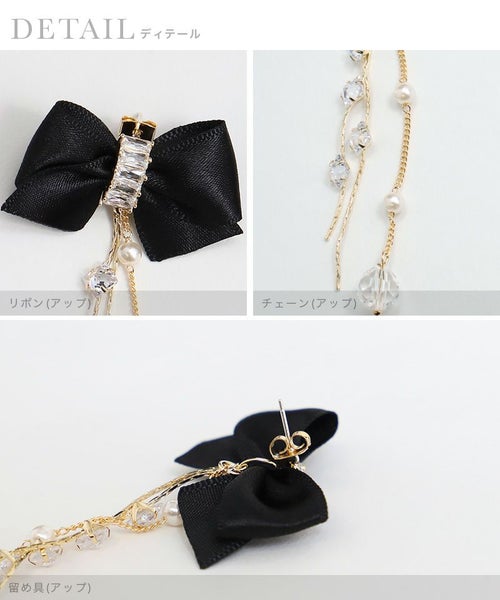 リボン×ビジューゴールドモチーフピアス (ブラック)