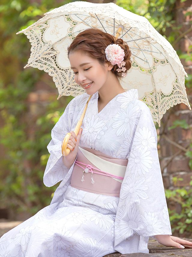 シックでレトロモダンなマーガレット花柄の大人可愛い3点セットのレディース浴衣 マーガレット柄 浴衣3点セット(浴衣+平帯or作り帯+下駄)ピンクベージュ