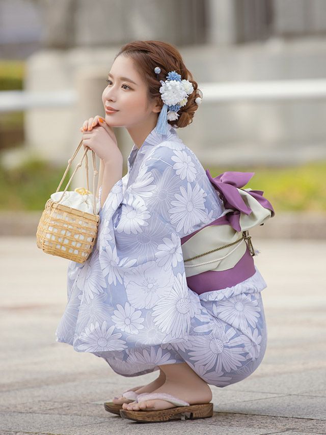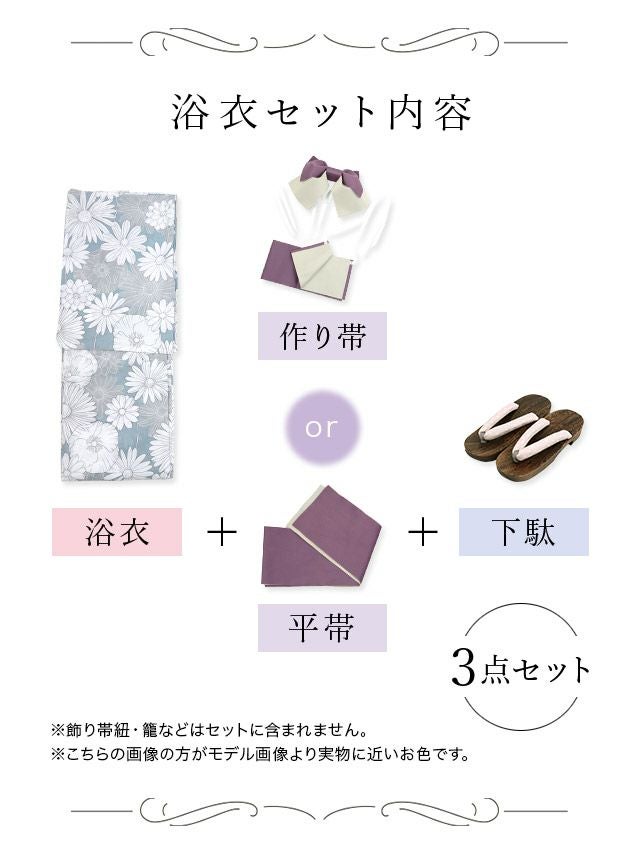 3. マーガレット柄 浴衣3点セット(浴衣+平帯or作り帯+下駄)ブルーグレー