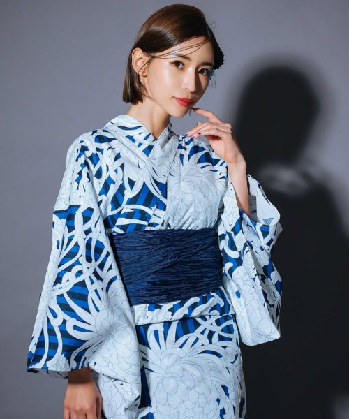 3. ストライプ×大輪白乱菊 大人の2点セットレディース浴衣(浴衣+兵児帯)