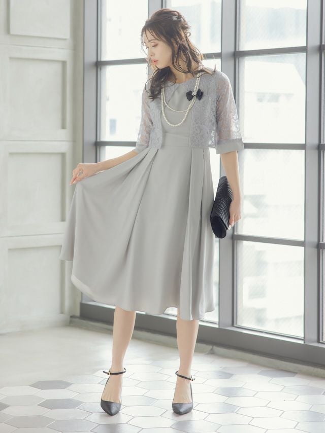 パールネックレス付きで小物合わせに迷わない◎ [SUPER SALE] レース切替半袖パールネックレス付きワンピースパーティードレス [パールネックレス付き] (Sサイズ~XXLサイズ)