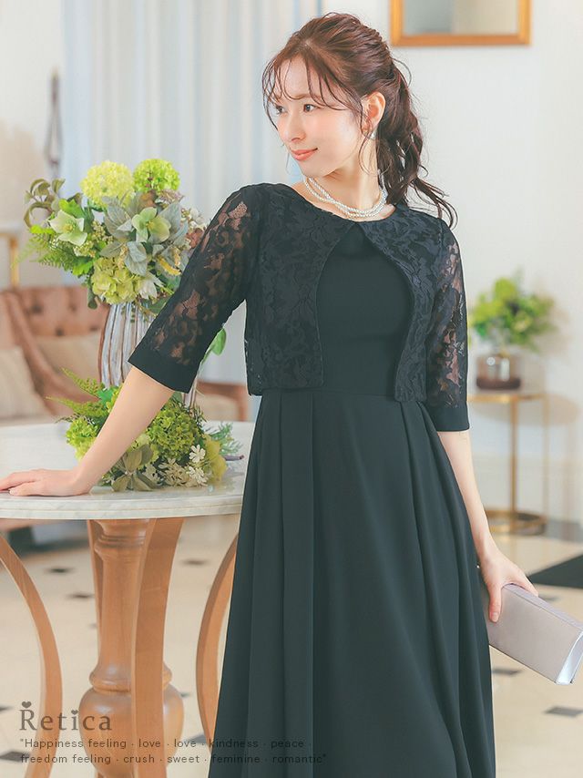 大人の気品漂う一着♪ [SUPER SALE] レース七分袖サテンワンピースミモレ丈パーティードレス (XSサイズ~4Lサイズ)
