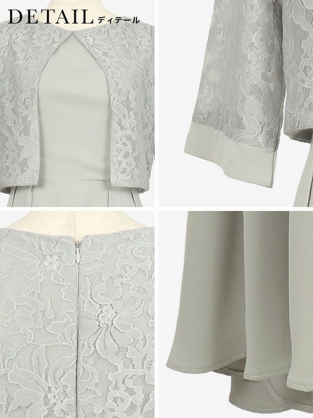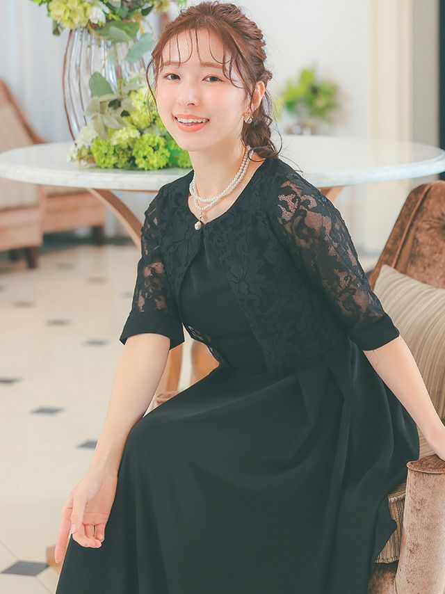 レースで女性らしさを引き立てる♪ [SUPER SALE] 半袖レースレイヤード膝丈ワンピースパーティードレス [パールネックレス付き] (Sサイズ~3Lサイズ)