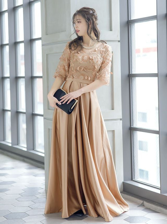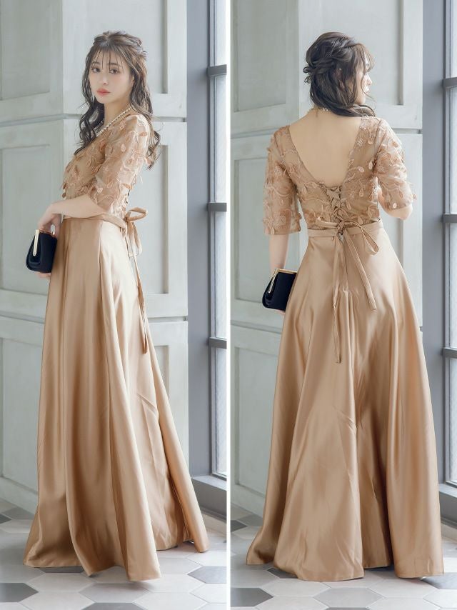 華やかなシーンにぴったり♪ [SUPER SALE] 立体刺繍レースバックリボン七分袖ロングスカートパーティードレス (XSサイズ~4Lサイズ)