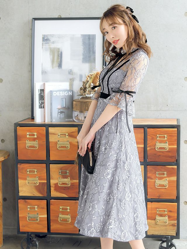 フェミニンでお洒落な一着♪ フレア×リボンデザイン花柄刺繍ミディアム丈パーティードレス (Sサイズ~XLサイズ)