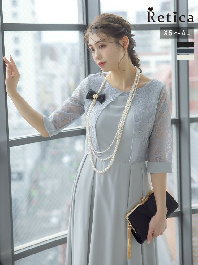 大人可愛い一着♪ ビーズ付きレース×サテン五分袖ひざ下丈パーティードレス (XSサイズ~XXXLサイズ)