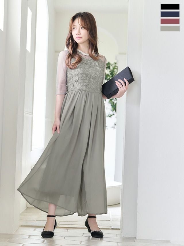 シンプル個性派さん向けドレス レーススリーブウエスト切替タックロングパーティードレス (Sサイズ~XLサイズ)