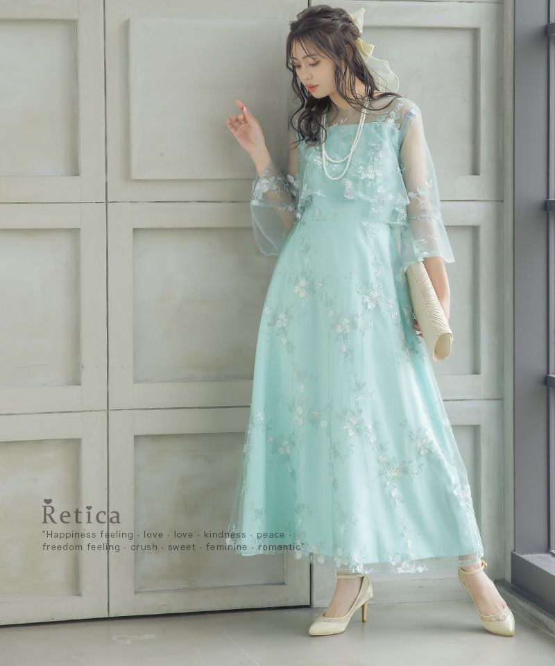 揺れるレースが上品に魅せる♪ レースフレア袖ロングパーティードレス (Sサイズ~XXLサイズ) [パールネックレス付き]