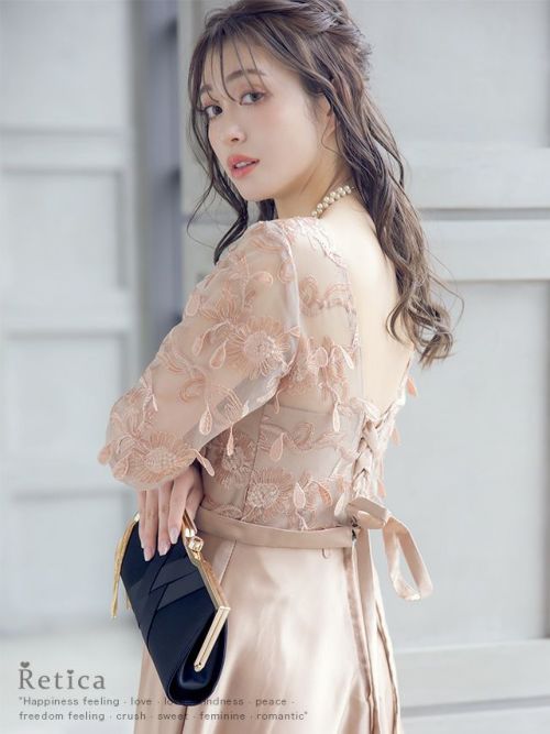 4. [SALE] 立体刺繍レースバックリボン七分袖ロングスカートパーティードレス (XSサイズ~4Lサイズ)