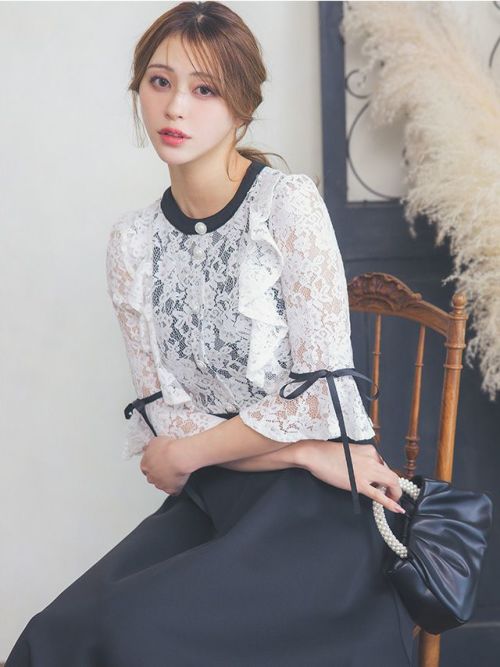 レースとフリルが甘く華やかなバイカラードレス、ハイウエスト切り替えの黒スカートが綺麗なAラインシルエットを作り、メリハリも付けてくれます! ドレスが華やかな分、お顔周りが明るく見えるようなヘアアレンジやアクセサリーがオススメ!パーティーや女子会で大活躍する一着です。