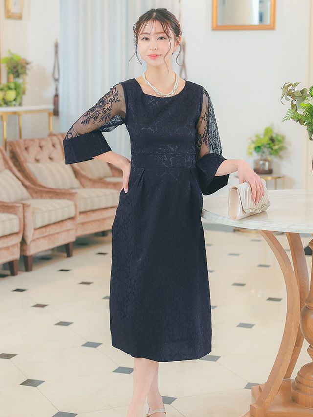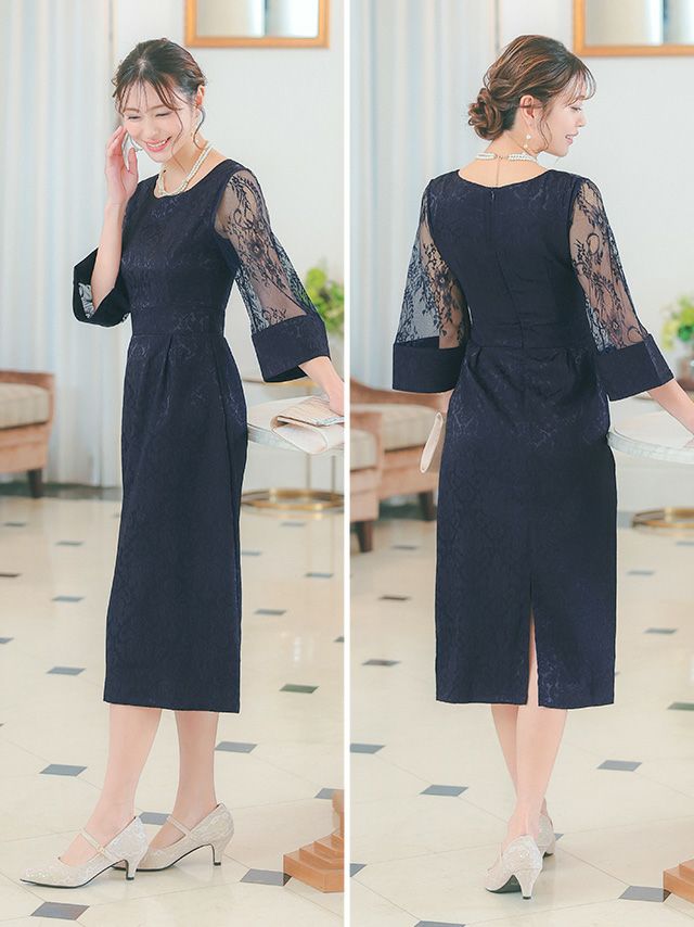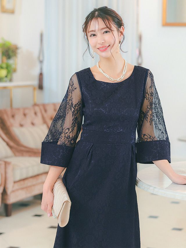 フェミニンだけど甘すぎない☆ [SALE] アラベスク柄レース袖シースルー膝丈ワンピースパーティードレス (Sサイズ~XXLサイズ)