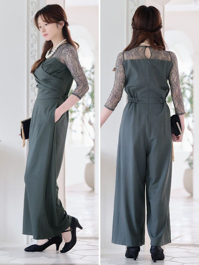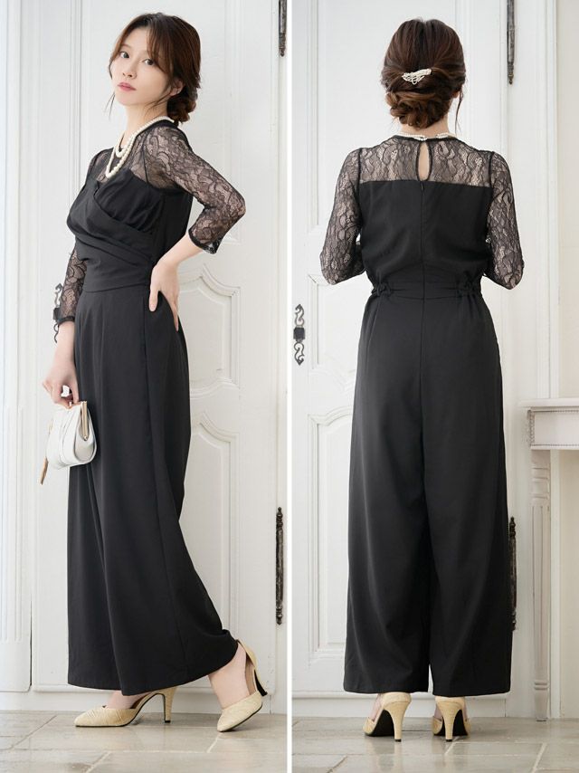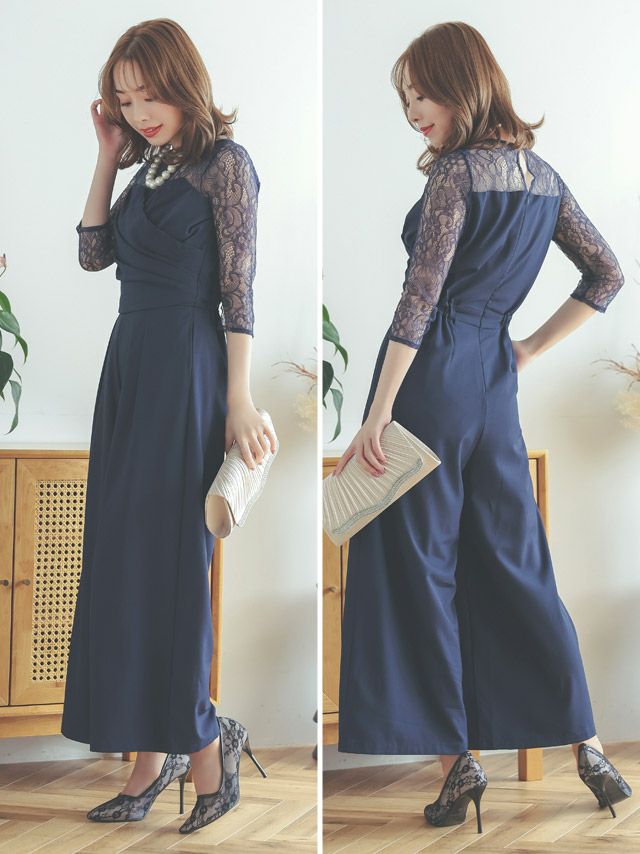 パーティードレス パンツ クルーネックレーススリーブカシュクール風オールインワンパンツドレス