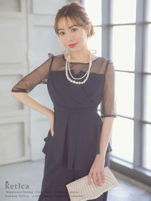 3. [SALE] レース五分袖ウエストリボンパンツセットアップパーティードレス (Sサイズ~3Lサイズ)
