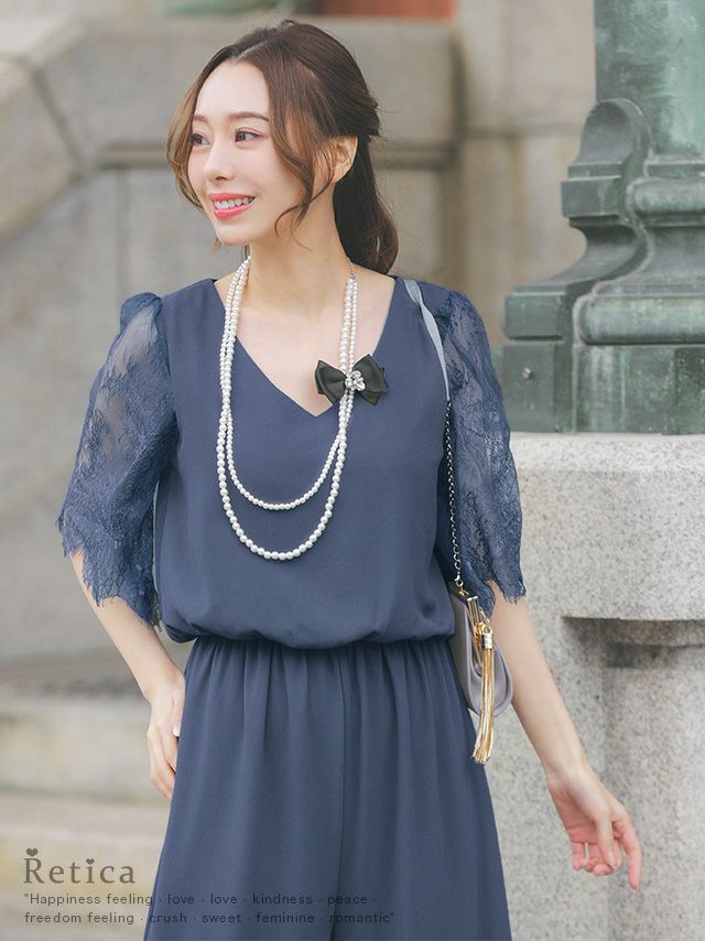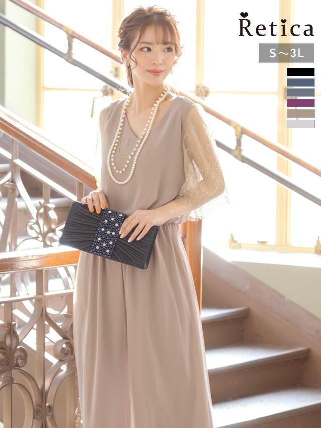 11/4再入荷★レースの袖が繊細で上品♪ [SALE] ワイドパンツウエストゴムワンカラープチプラパーティードレス (Sサイズ~XXLサイズ)