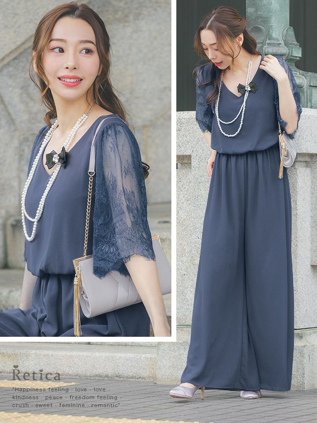大人なムード漂うパンツドレス♪ [SALE] フレアレース袖Vネックラインワイドパンツプチプラパーティードレス (Sサイズ~3Lサイズ)