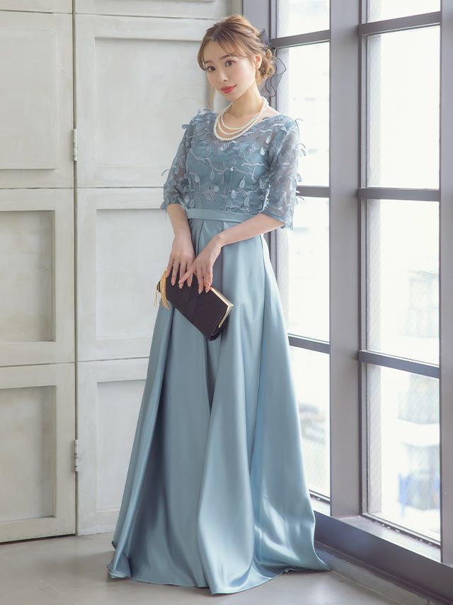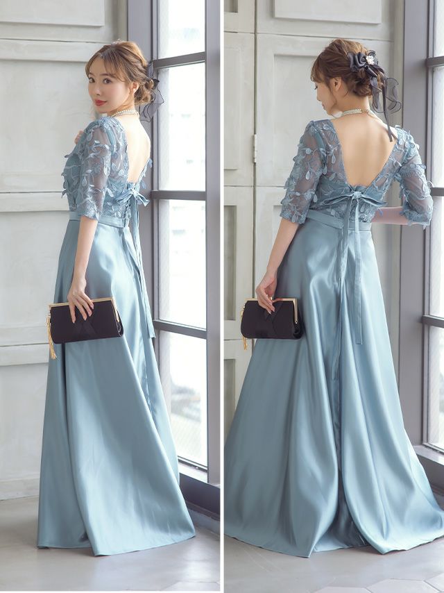 華やかなシーンにぴったり♪ [SALE] 立体刺繍レースバックリボン七分袖ロングスカートパーティードレス (XSサイズ~4Lサイズ)