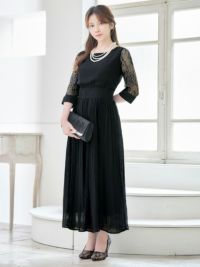 袖ラメレースシフォンフレアロングパーティードレス (Sサイズ~4Lサイズ)