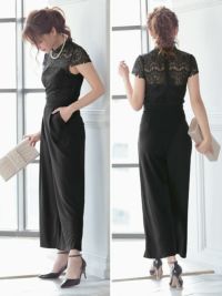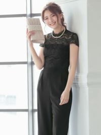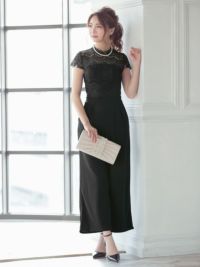 パーティードレス パンツ ハイネックレース切替フレンチスリーブパンツドレス