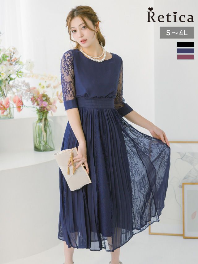 4. [SALE] チュールレーススリーブウエスト切替ドレープシフォンAラインロングパーティーワンピースドレス (Sサイズ~4Lサイズ) (小澤美里)[Retica/レティカ]