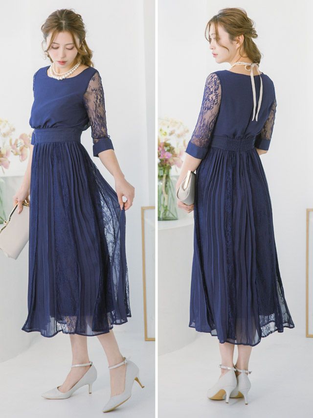 チュールレーススリーブウエスト切替ドレープシフォンAラインロングパーティーワンピースドレスのカラーバリエーション