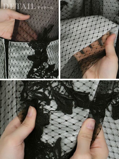 スパンコール付き立体刺繍フレンチスリーブミモレ丈ワンピースパーティードレスのスペック表