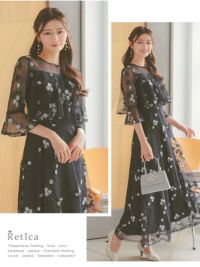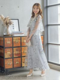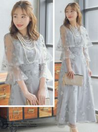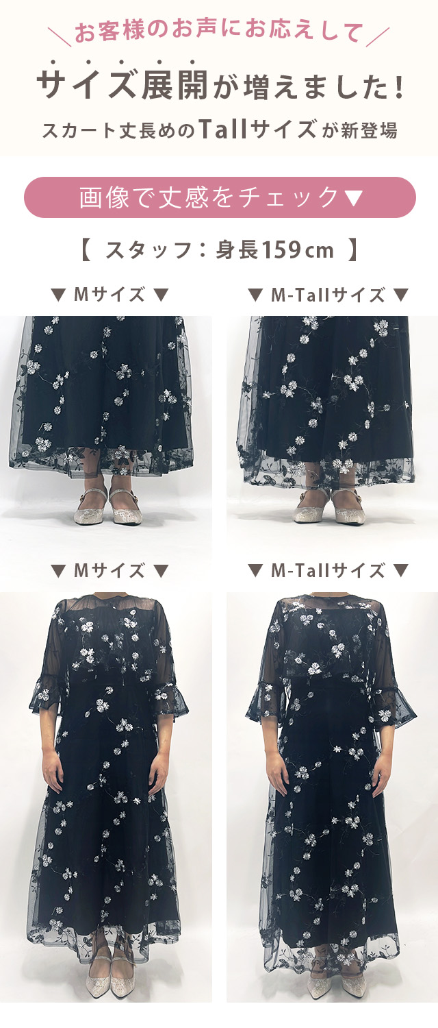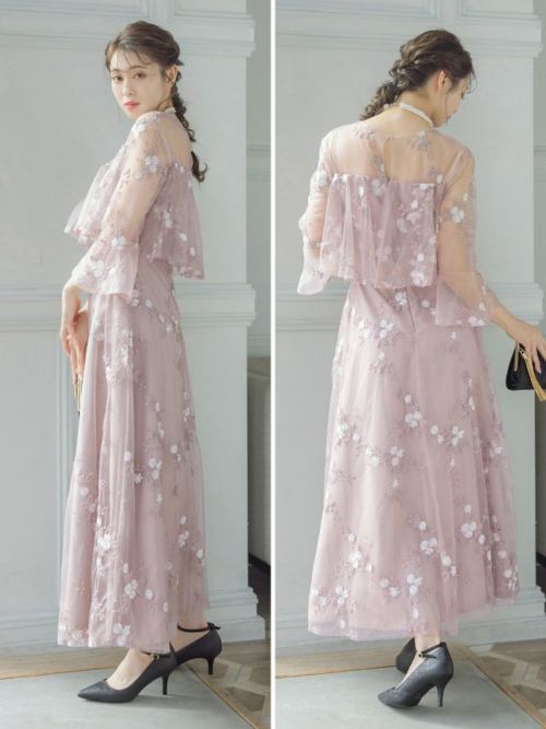 3. フラワー刺繍デコルテシースルーベルスリーブ袖ロングスカートパーティードレス (XSサイズ~4Lサイズ)<高身長サイズあり>