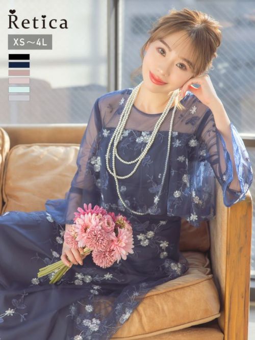 4. フラワー刺繍デコルテシースルーベルスリーブ袖ロングスカートパーティードレス (XSサイズ~4Lサイズ)<高身長サイズあり>
