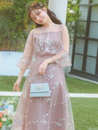 フラワー刺繍デコルテシースルーベルスリーブ袖ロングスカートパーティードレスの商品詳細1