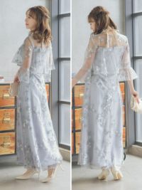 フラワー刺繍デコルテシースルーベルスリーブ袖ロングスカートパーティードレスのスペック表