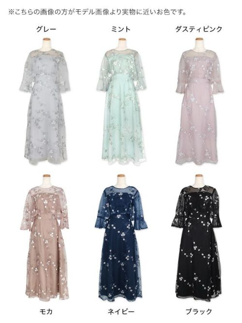 フラワー刺繍デコルテシースルーベルスリーブ袖ロングスカートパーティードレスのカラーバリエーション