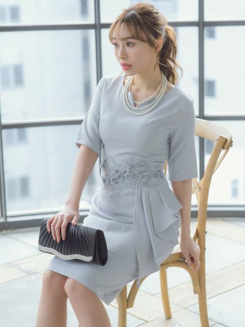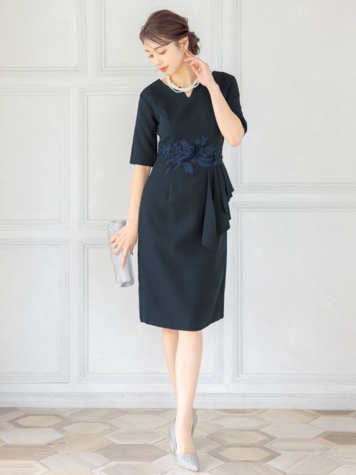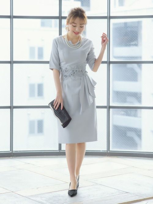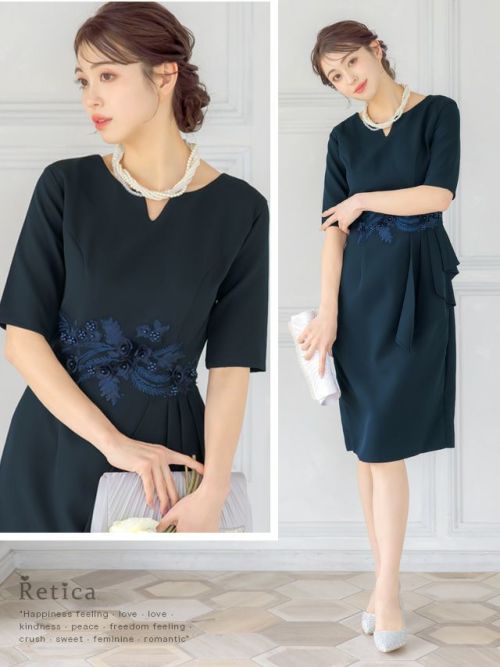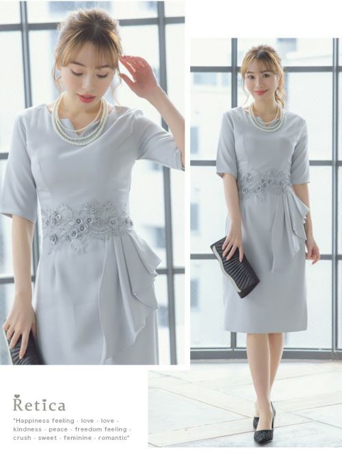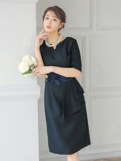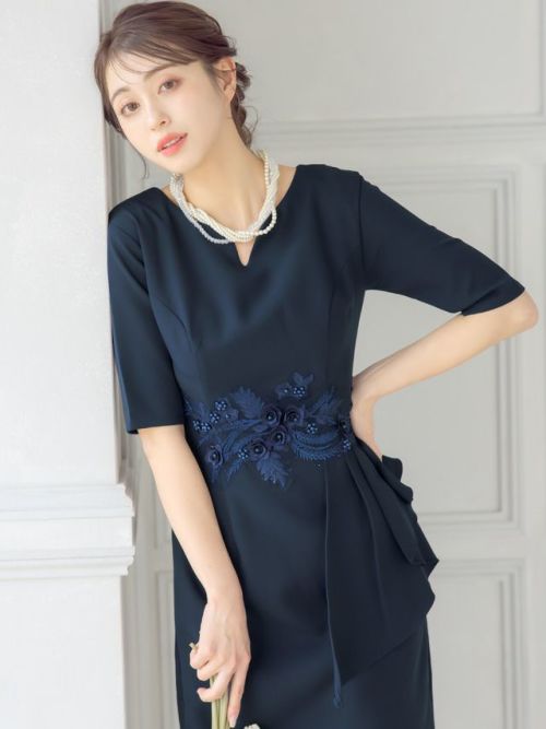 ウエスト部分の立体フラワーレースが可愛いミディアムドレス♪
