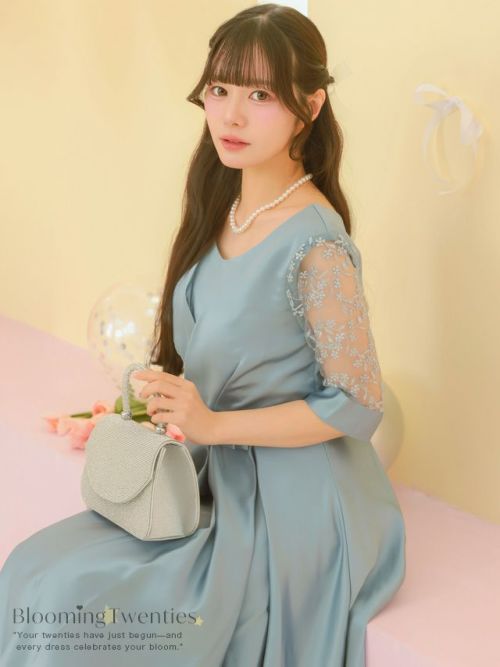 やわらかなライトブルーが透明感を引き立ててくれる一着で、明るい会場や昼間の結婚式にとてもよく映えそうです。 首元が開いているので、短めのパールネックレスや小ぶりの耳飾りと組み合わせるのがおすすめです。 ほんのりとしたサテンの光沢があって自然な華やかさが出るので、写真映えしやすいと思います。
