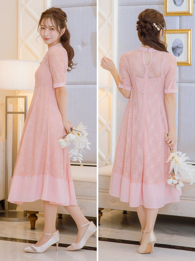 パーティードレス 結婚式 レース切替半袖パールネックレス付きワンピースドレス