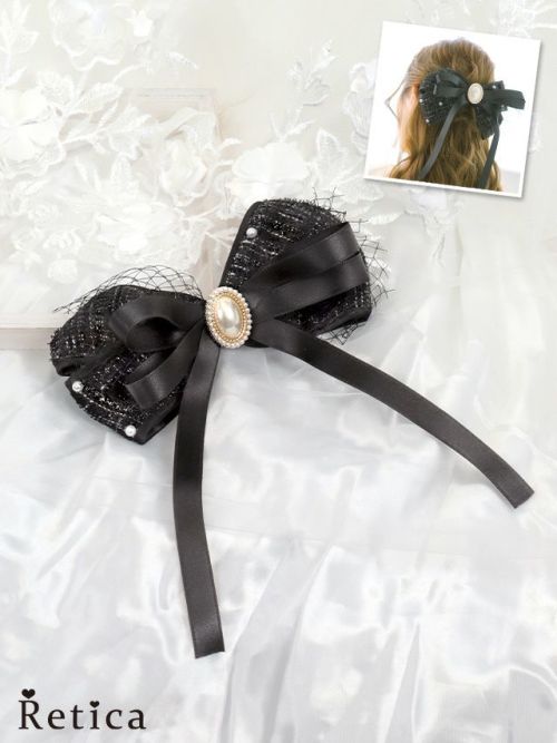 パール付きツイード生地ビッグリボンヘアアクセサリー (ブラック)