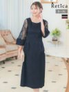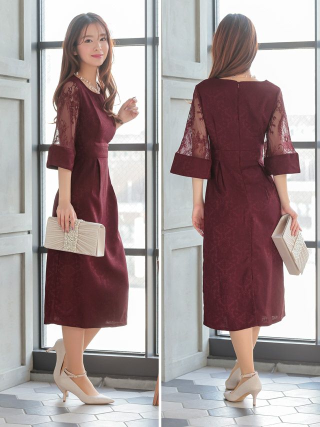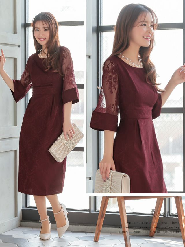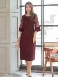パーティードレス 結婚式 総柄袖レース切り替えワンピースドレス