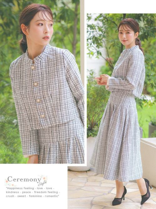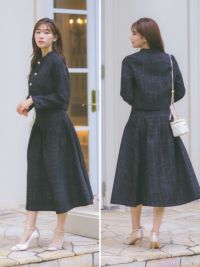 パールボタンショート丈ジャケット×ロングスカート2ピースセットスーツありサイドバック全身