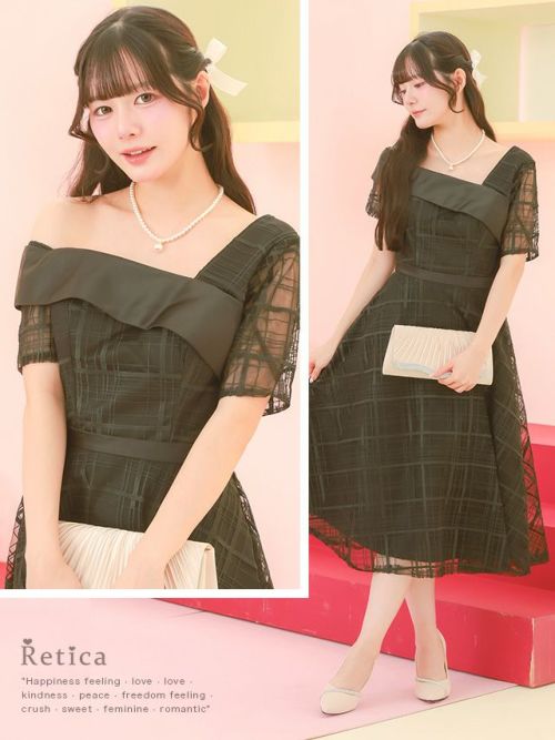 シースルーチェックワンショルダーミモレ丈フレアドレスのカラーバリエーション