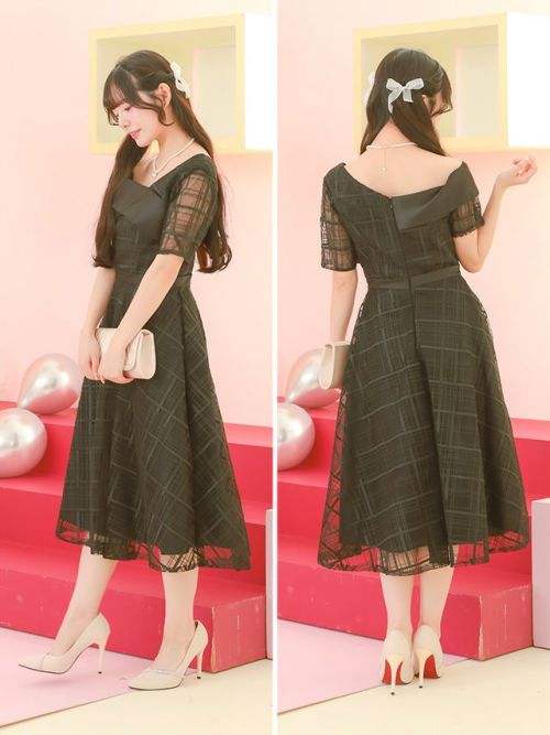 5. シースルーチェックワンショルダーミモレ丈フレアドレス (XSサイズ~4Lサイズ)
