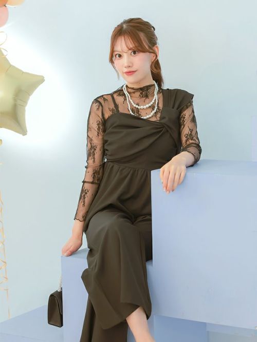 ワンショルダーねじれデザイン長袖レースパンツスタイルセットアップのフロント全身