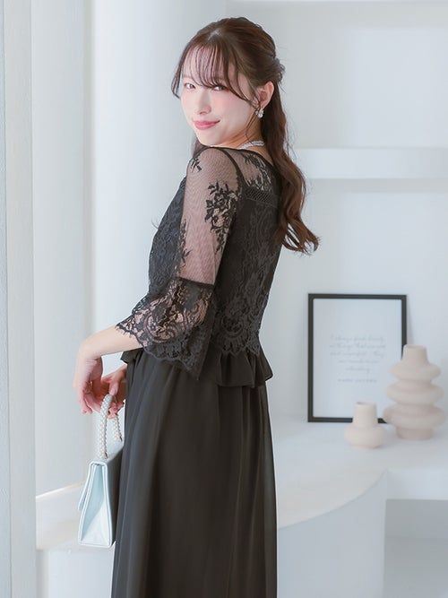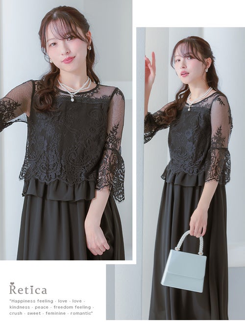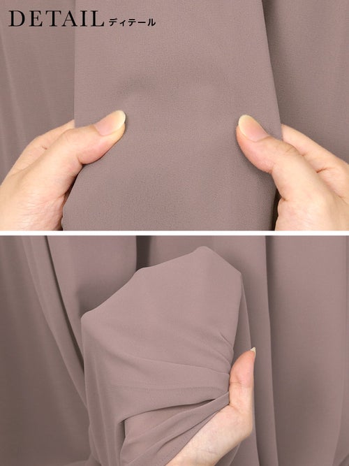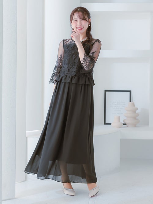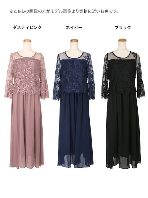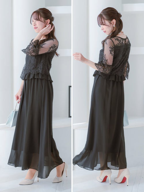落ち着いたスモークピンクが上品で、年齢を重ねても着やすいデザインです。 ロング丈で肌の露出を抑えつつ、気になる部分をさりげなくカバーしてくれるので、結婚式のゲストやお子様の式典、パーティーまで幅広く活躍できそうです。袖の透け感がしっかりあるので、肌寒い時期やフォーマルな場ではショールやボレロなどの羽織りものがあると安心です。