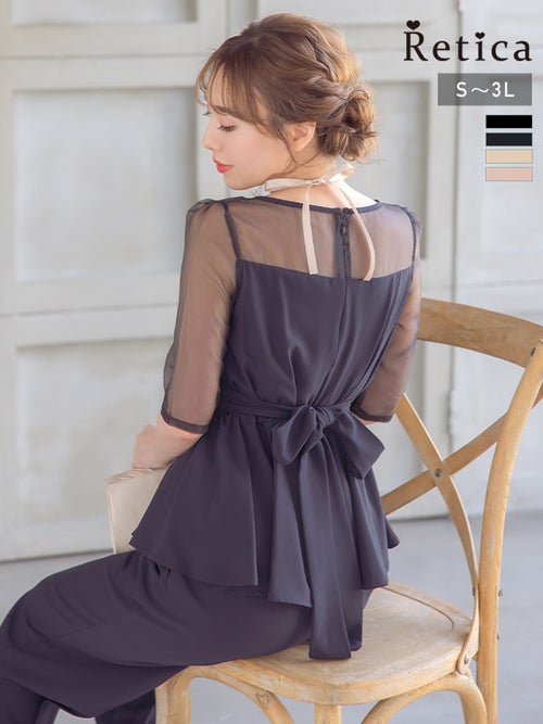 パンツドレス セットアップ パーティードレス シースルー五分袖 袖あり ワイドパンツ ウエストリボン 二の腕カバー 大きいサイズ 結婚式のカラーバリエーション