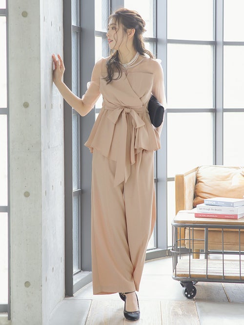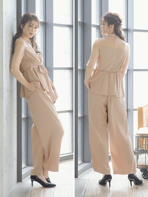 159cmスタッフRinが着用するパンツドレス セットアップ パーティードレス シースルー五分袖 袖あり ワイドパンツ ウエストリボン 二の腕カバー 大きいサイズ 結婚式 (ピンクベージュ)のフロント画像