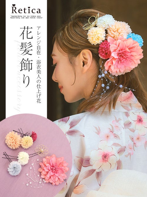 カラフルな色合いがかわいい♪ 浴衣小物 パール下がり付きダリアマム花飾り浴衣ヘアアクセサリー8点セット (オフホワイト/ピンク)