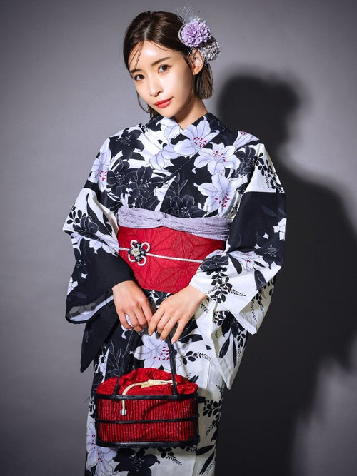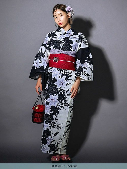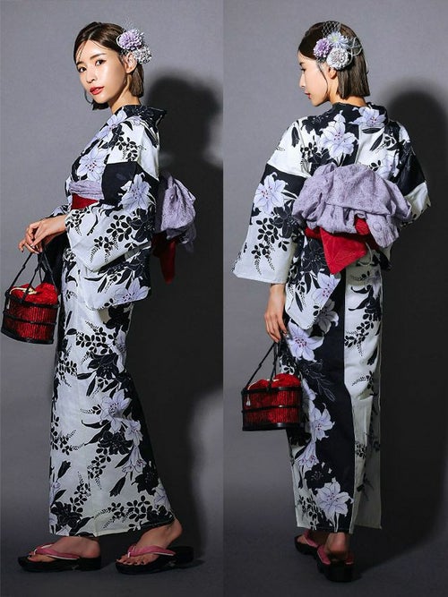 3. [超早割] モノトーン×萩百合 大人の2点セットレディース浴衣(浴衣+平帯or作り帯)