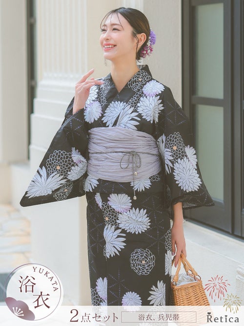 気品漂う菊模様大人レトロな黒浴衣2点セットのセット内容