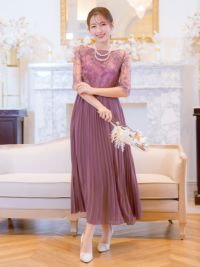 豪華な刺繍が特別感♪ [SALE] 花柄チュール刺繍五分袖プリーツロングスカートパーティードレス (Sサイズ~3Lサイズ)