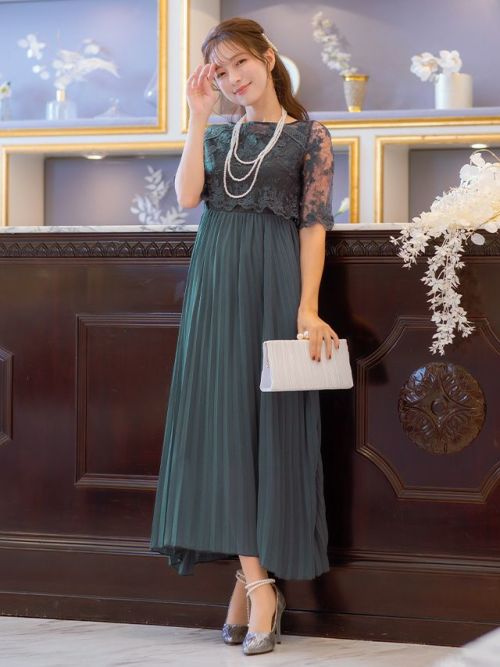 花柄チュール刺繍五分袖プリーツロングスカートパーティードレスのフロント全身