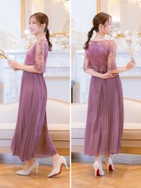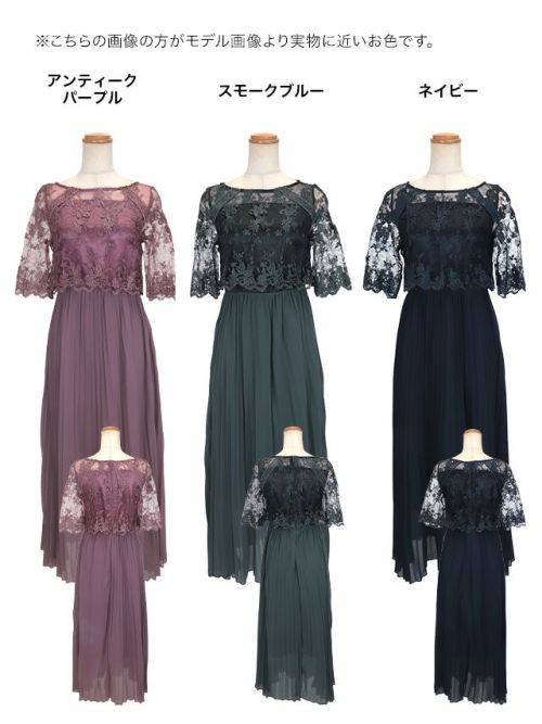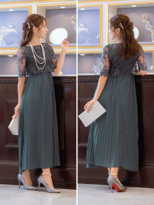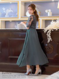 刺繍レース×プリーツ切り替えミモレ丈パーティードレスのカラーバリエーション