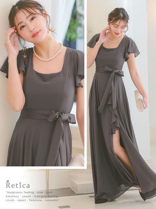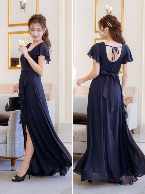 フリルスリーブスリット入りロング丈パーティードレスのカラーバリエーション