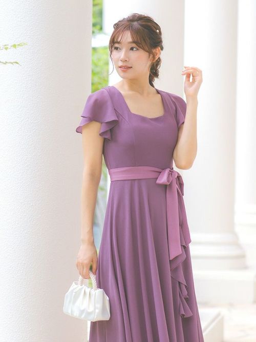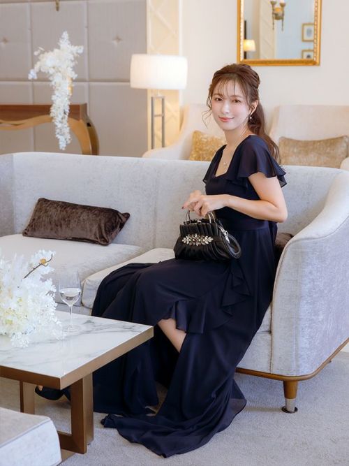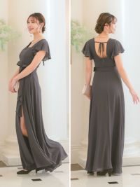 4. フリルスリーブスリット入りロング丈パーティードレス(Sサイズ~4Lサイズ)